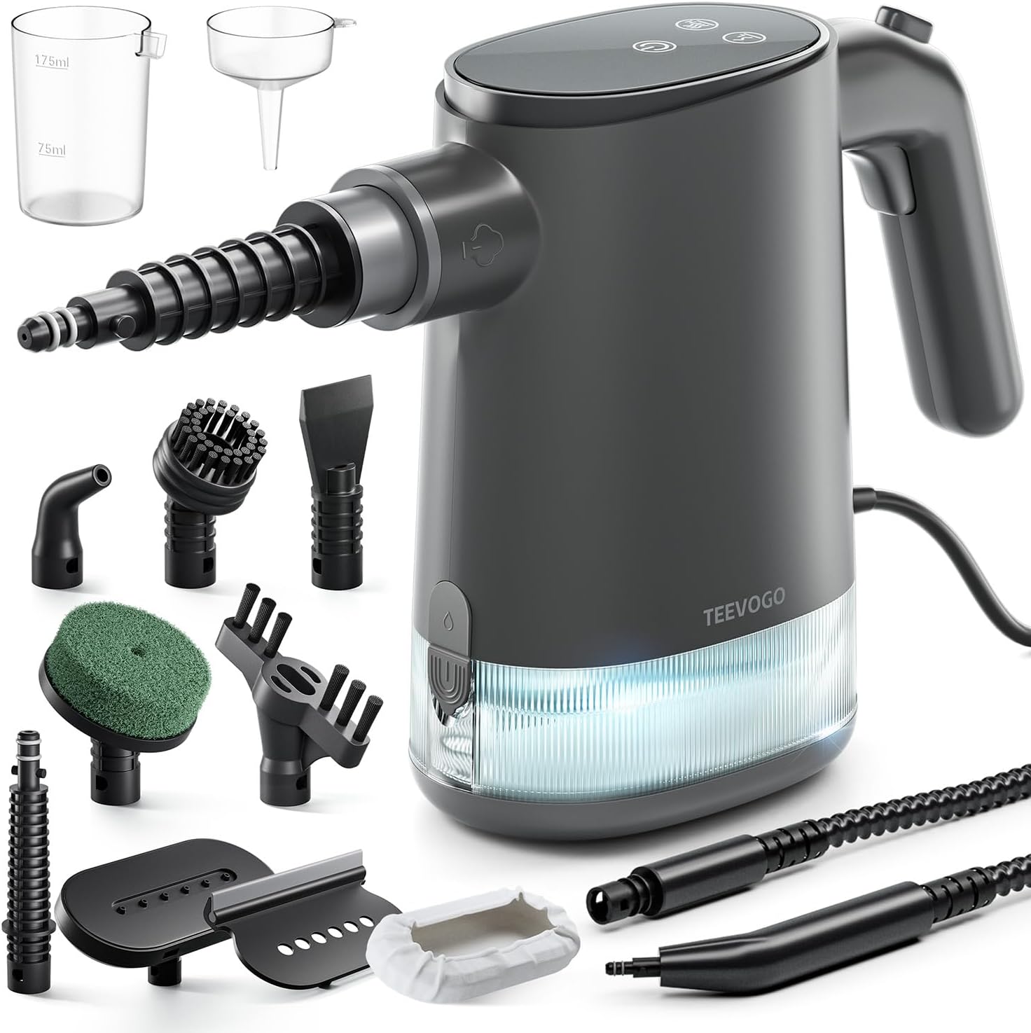 - Full 12 Attachments: Equipped with 1*round brush, 1* grout brush, 1*accessory nozzle, 1* angle concentrator tool, 2*squeegee, 1* extension hose and nozzle, 1*clothes, 1*scouring pad brush, 1*flat scraping tool, 1* funnel, 1*measuring cup. Effortlessly tackle kitchen counters, stovetops, sinks, bathroom, toilet, bed, windows, walls, floors, tiles, sofas, mattresses, upholstery, household blinds and even car interiors—all with one powerful steamer