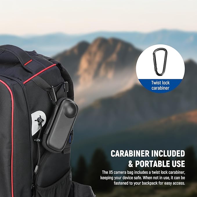- 【Carabiner Included & Portable Use】 The X5 camera bag includes a twist lock carabiner, keeping your device safe and preventing accidental drops while attached to your backpack. Weighing just 3.5 oz (98 g), it fits easily in your backpack or pocket. When not in use, the carrying bag can be securely with the carabiner, ensuring it is always within reach